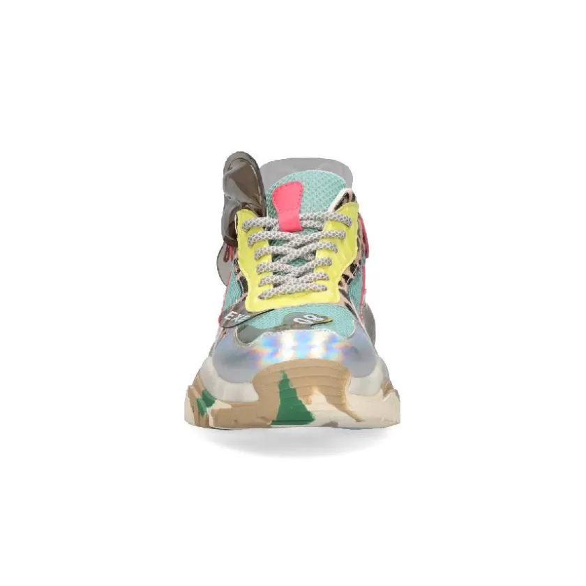 Sneaker em pele sintética multicolor. Elaborada com vários materiais.