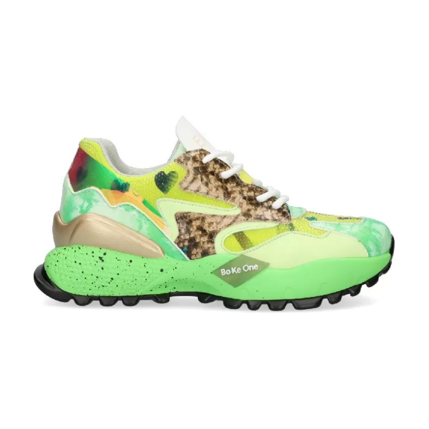 Sneaker em pele sintética multicolor. Elaborada com vários materiais.